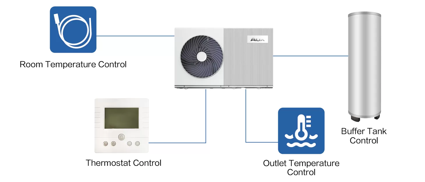 В соответствии с фактическими условиями установки и привычками использования, пользователи могут выбрать один из четырех методов управления: управление температурой на выходе, управление с помощью датчика температуры в помещении, управление с помощью регулятора температуры в помещении и управление с помощью буферной емкости, чтобы сделать помещение комфортным и удовлетворить требования пользователей.
