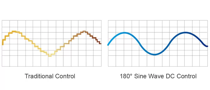 Инверторный компрессор постоянного тока, использующий векторное управление синусоидой 180°, обеспечивает плавную работу двигателя и повышает его эффективность.