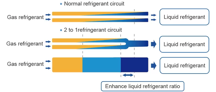 Оптимизированная конструкция контура хладагента 2 к 1, повышающая эффективность теплообмена и увеличивающая соотношение жидкости, поступающей в испаритель.